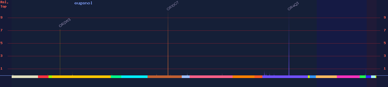 | OR10G7 | 80 | -8 2, -3.83 3, -9 7, -6.29 10 | 5.654 2, 3.8333 3, (agonist) 7 | vanilla, clove, carnation, smoky, spicy | |