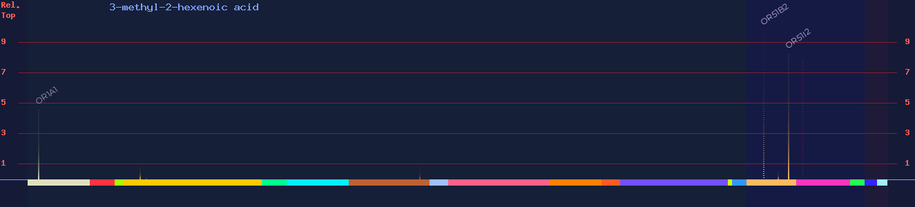 | OR51B2 | 100 | -4.4 3, -4.7 4 | 10 3, 10 4, (agonist) 6 | civet, cheesy, sour, honey, rancid | |