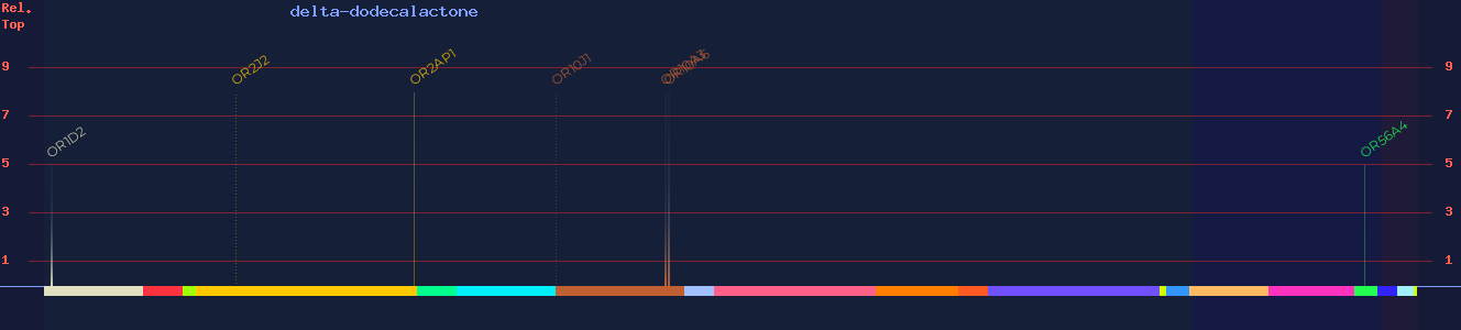 | OR10J1 | 80 | - | (probable agonist) 4, (agonist) 5 | peach, coconut, lactonic, creamy, buttery | |