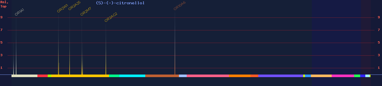 | OR1A1 | 73 | -4.04 2, -5.03 3, -5.03 4 | 9 2, (agonist) 3, 4 4, 2 9 | citrus, waxy, rose, herbal, fresh, sweet, orange, caraway, fatty, spearmint | |