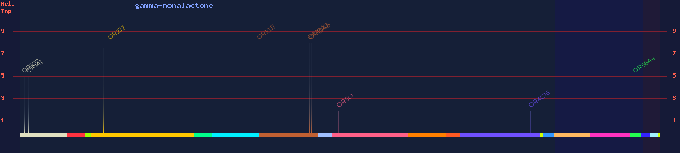 | OR10J1 | 80 | - | (probable agonist) 7, (agonist) 8 | peach, coconut, lactonic, creamy, buttery | |