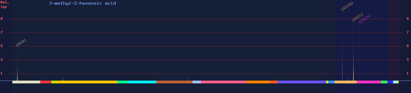 | OR51B2 | 100 | -4.4 3, -4.7 4 | 10 3, 10 4, (agonist) 6 | civet, cheesy, sour, honey, rancid | |