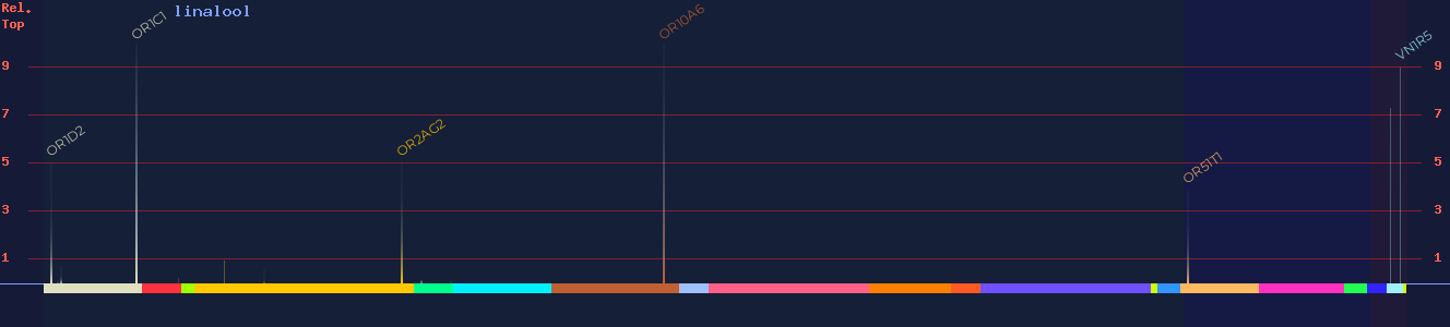| OR1C1 | 100 | -7.86 2, -2.79 3, -2.57 4, -2.8 8, -6.09 11, -3.69 13 | 1.4377 2, 10 3, (agonist) 4, 0.5294 8, (agonist) 11 | blueberry, bois_de_rose, citrus, sweet, rose | |